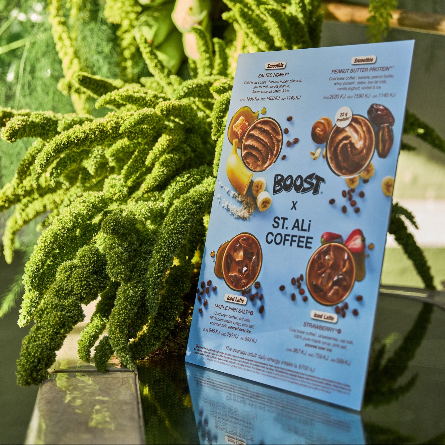 ST. ALi IS LANDING IN BOOST JUICE STORES NATIONWIDE. FOUR DRINKS. FRESH AND REAL INGREDIENTS. OUR ST ALI WIDE AWAKE COLD BREW AT THE CORE.