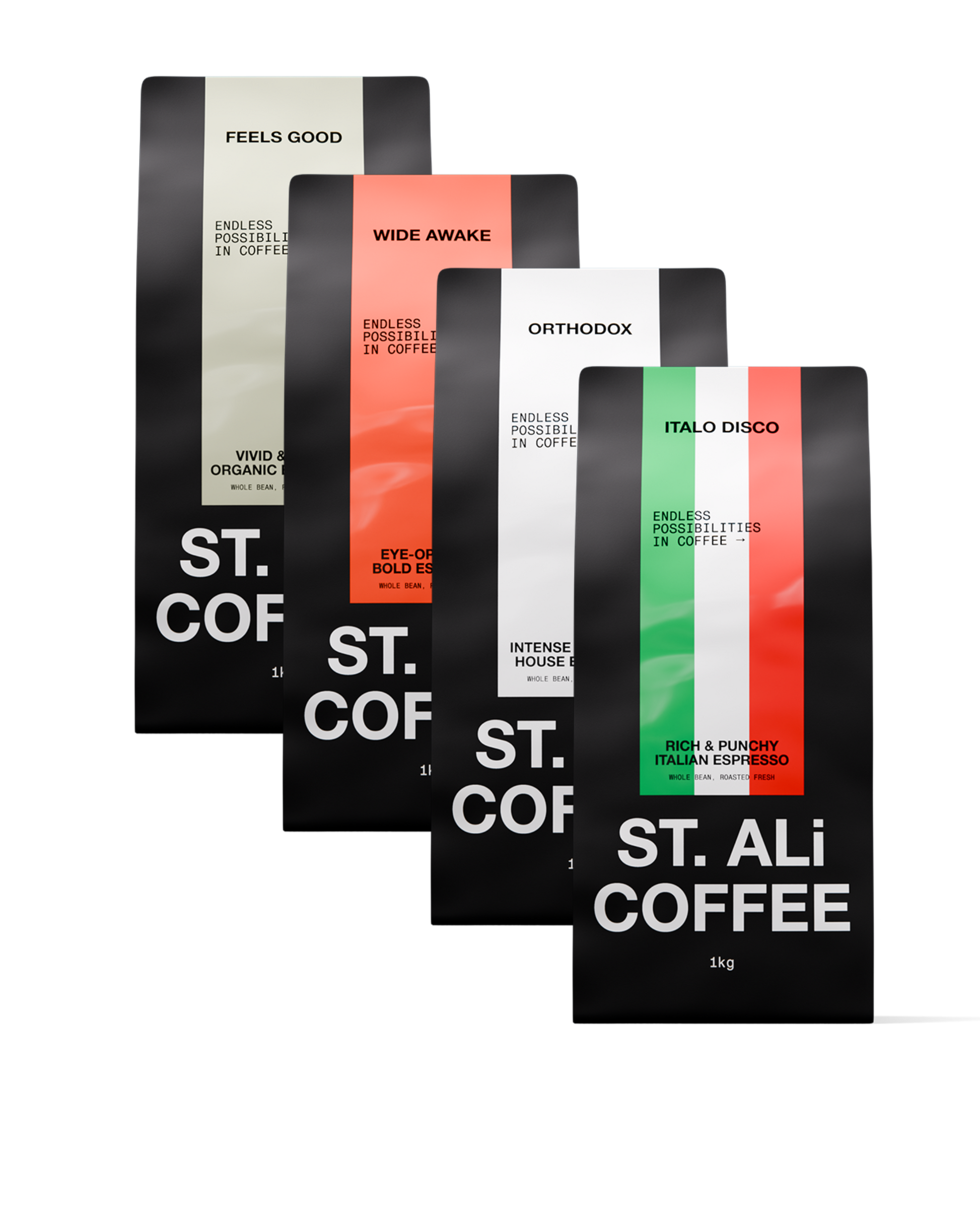 1kg of freshly roasted ST. ALi coffee delivered straight to your front door every month for half a year, choose from any of our flagship blends: Wide Awake, Italo Disco, Orthodox, or Feels Good.