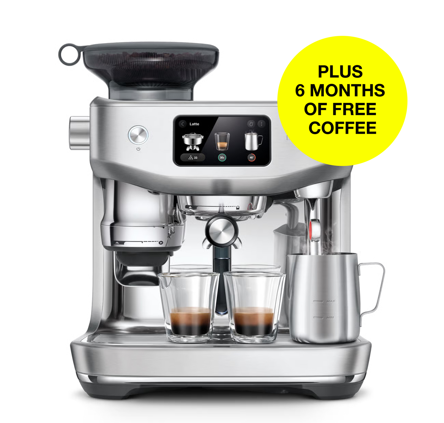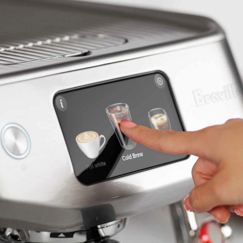 Textures dairy, soy, almond, or oat with selectable 40–75 °C temps and 8 texture levels; Auto Queue times steaming to finish right after your shot.